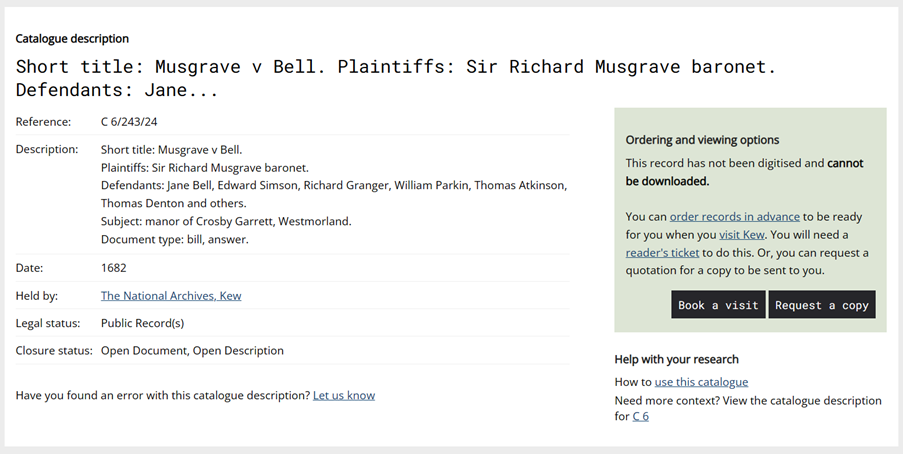 In England and Wales, the records of the Court of Chancery are incredibly useful for historians interested in all manner of subjects. From the thirteenth century onwards, Chancery provided the record-keeping function for the king’s council (and later Parliament). Chancery records are, essentially, the records of civil cases and lawsuits brought by people against each other. They were distinct from the criminal courts, as there was no jury and no cross-examination even after the latter was introduced (but not properly used) in other courts in the eighteenth century. Many Chancery records have survived. There are an estimated ten miles of documents in The National Archives at Kew, so the chances of finding something relevant to your area of research are reasonable. Chancery records are incredibly detailed. They often contain information about several generations of a family and will always distinguish between different people of the same name. They can list long-since lost property deeds, marriage settlements, and wills. Accounts, lists of lands and values, as well as inventories of personal goods, are often included as evidence. The format of the documents themselves can help in establishing or confirming family details and personal histories, often with the complainant establishing the case grievance by going back through time. The documents reveal many details about land ownership, debts, merchants, and monetary values. Detailed inventories reveal fascinating glimpses into how people lived, the furniture they owned, the clothes they wore, and the food that they ate. The documents do not just record the disputes of the wealthy gentry; collected within them are the personal details and testimonies of people from all positions in society, lending a valuable voice to people who were often excluded from documents of the period or the ability and means to tell their own story. Musgrave v Bell [TNA, C 6/243/24, 1682]. Image copyright of The National Archives. Not to be reproduced without permission. These records have been thankfully well-catalogued and are all held centrally. To conduct a search for Chancery records relevant to your place of study use The National Archives Discovery page with the ‘Advanced search’ function. Put ‘C’ in the reference box. A catalogue description on Discovery for C 6/243/24 a Chancery case between Musgrave v Bell from a dispute over the manor of Crosby Garrett. Despite their usefulness, however, these documents can also be difficult to grapple with. The nature of the cases – consisting, essentially, of just an accusation, the defendant’s response, and perhaps a few periphery documents – means it may be difficult to draw out an accurate story or confirm the details in any one person’s testimony. Caution is advised when using these records for evidence or to confirm claims. Some palaeographical skills are required to decipher and read documents, although Chancery records tend to be more legible and in better condition than other documents of the period. The documents themselves may also be cumbersome, dirty, and heavy to handle, so assistance may be required in the retrieval and handling of documents. For many places, records are likely to survive for the sixteenth century onwards, though their nature of recording past generations makes them useful for research beyond the date of the case. References and Resources: Read this guide to further records of interest which also includes some of use in the early modern period see this Medieval and early modern research guide by The National Archives. Susan Moore, Tracing Your Ancestors Through the Equity Courts: A Guide for Family and Local Historians (2017). Nat Alcock, Tracing History Through Title Deeds: A Guide for Family and Local Historians (2017). Thank you for reading How-to History. This post is public so feel free to share it. How-to History is a reader-supported publication.